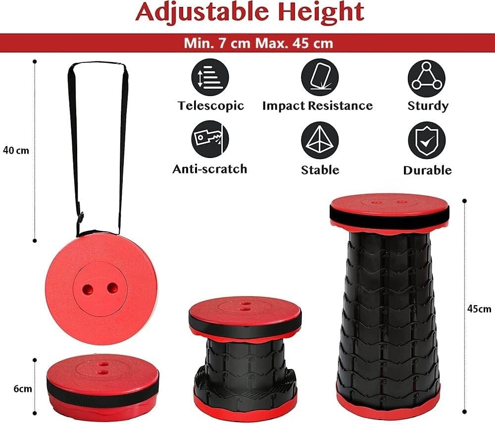 Sgabello Pieghevole da Campeggio Portatile | Alta Qualità, Capacità 220 Kg | Altezza Regolabile, Design Salvaspazio | Sedia da Viaggio Leggera, Rosso